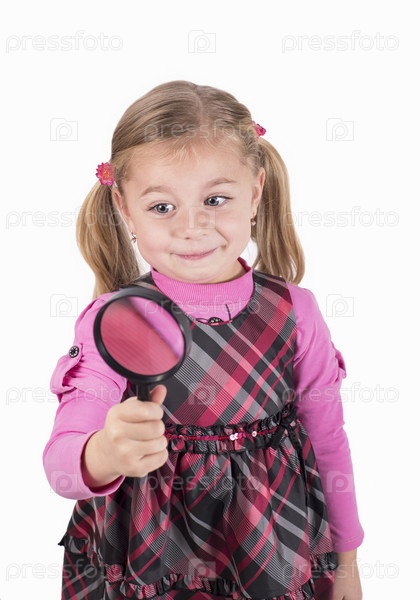 Маленькая девочка, внимательно глядя через увеличительное стекло