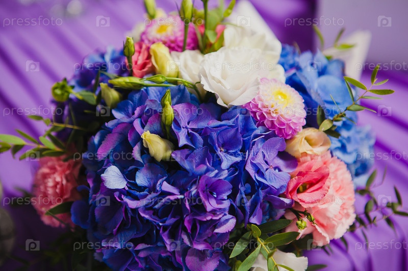 Красивые цветы на столе в день свадьбы. Фиолетовые цветы