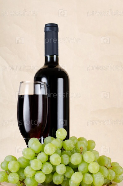 Красное вино и гроздь зеленого винограда на фоне бумаги