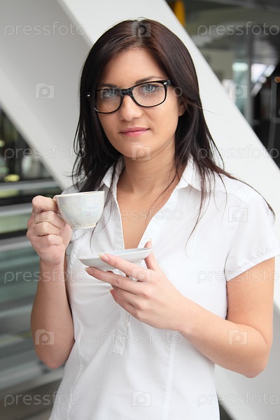 Портрет брюнетки в очках с чашкой кофе