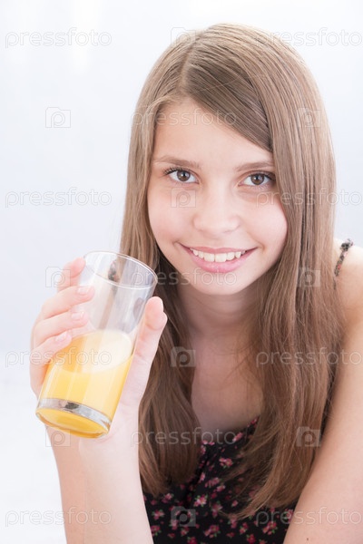 Девочки-подросток пьет апельсиновый сок