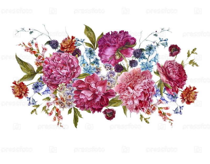 Акварель цветочный букет с бордовыми пионами в винтажном стиле