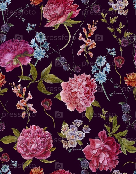 Акварель бесшовный паттерн с бордовыми пионами