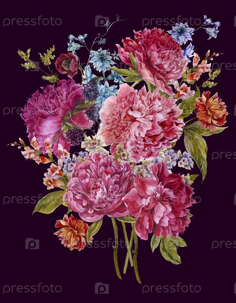 Акварель цветочный букет с бордовыми пионами в винтажном стиле