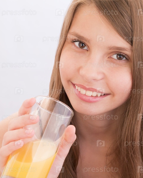 Девочки-подросток пьет апельсиновый сок