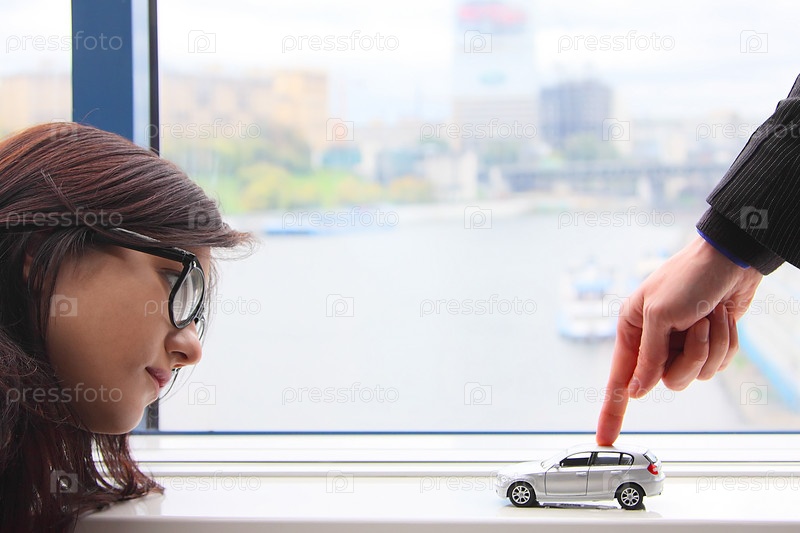 Девушка в очках смотрит на модель игрушечной машины