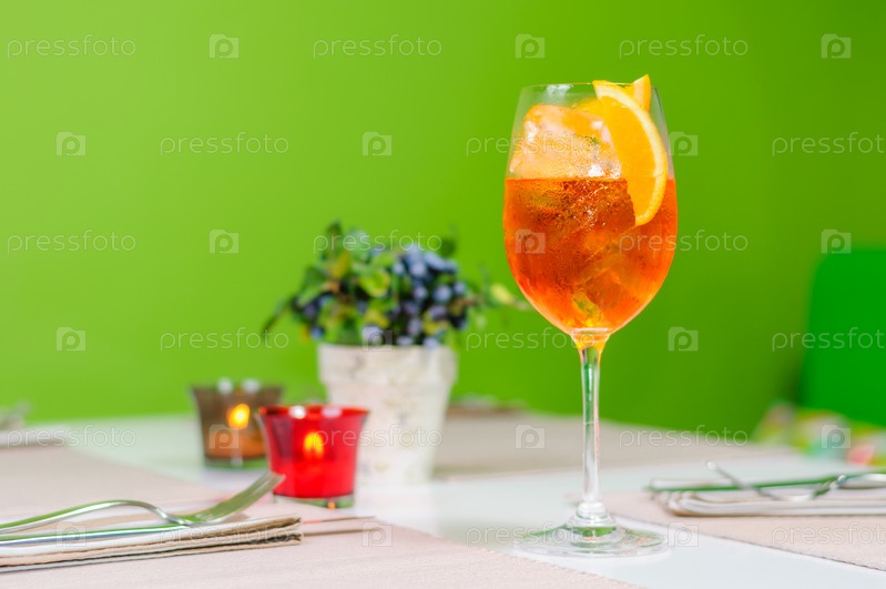 Оранжевый напиток с дольками апельсина в высоком бокале на белом столе и зеленом фоне