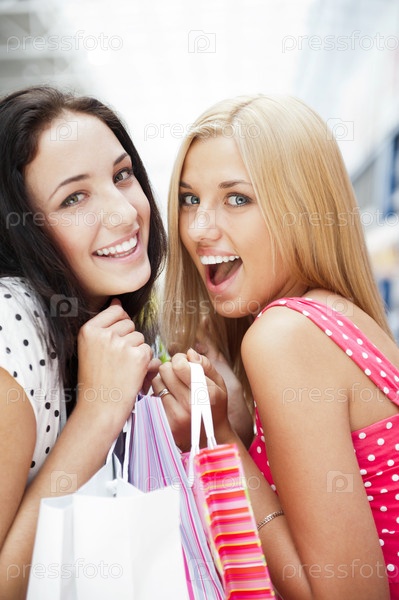 Молодые симпатичные подруги в торговом центре