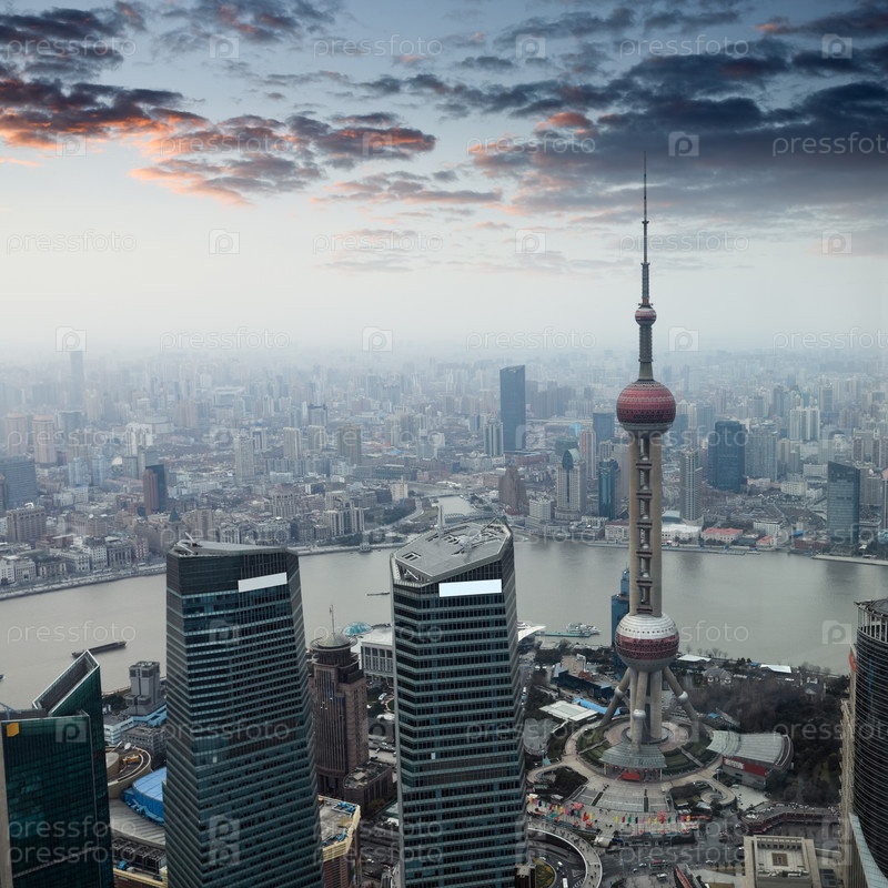Шанхай в сумерках с зарево заката