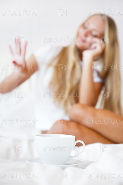 Молодая красивая девушка с кружкой кофе в постели смотрит на обручальное кольцо