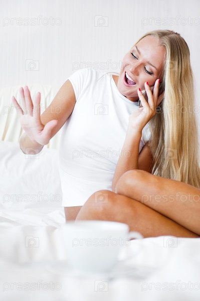 Молодая красивая девушка с кружкой кофе в постели смотрит на обручальное кольцо и разговаривает по телефону