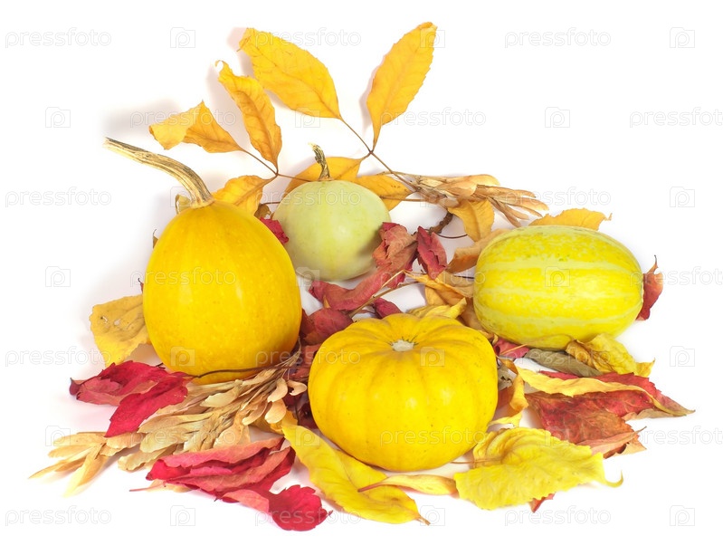 Тыквы и осенние листья на белом фоне