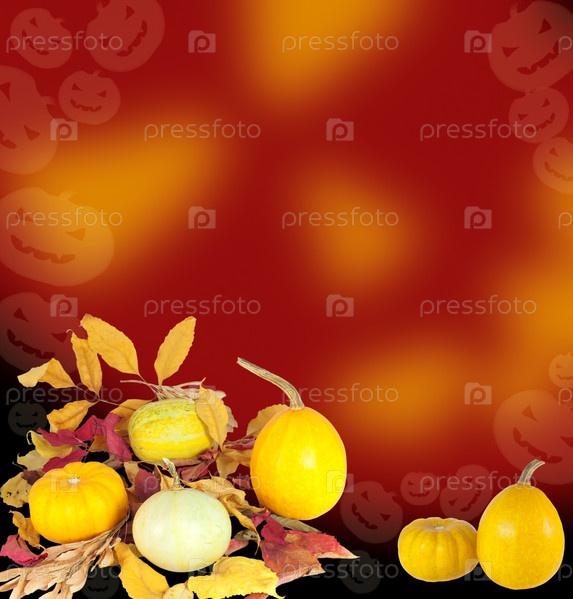 Тыквы и осенние листья на ярком фоне