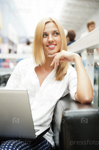 Портрет молодой симпатичной блондинки с ноутбуком