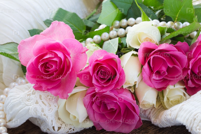 Розовые и оранжевые розы с кружевами