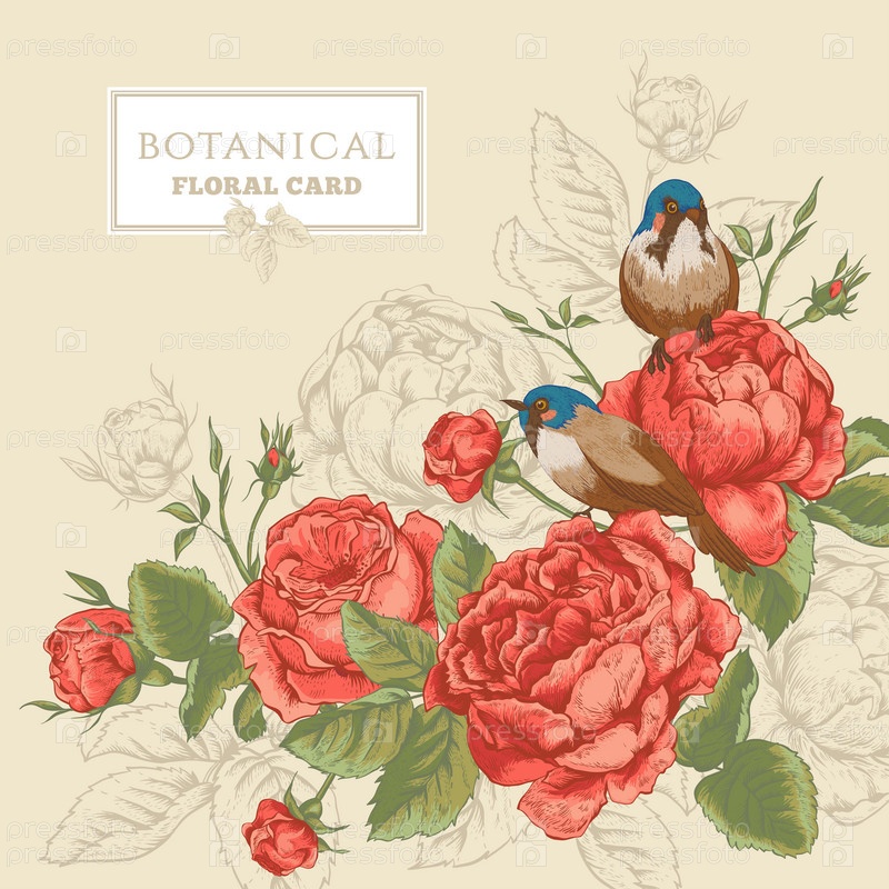 Ботанический цветочные карточки с розами и птицы