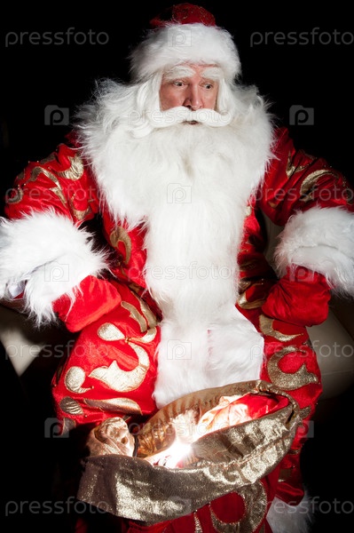 Дед Мороз с мешком подарков на черном фоне крупным планом