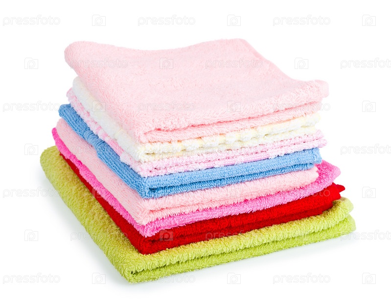 Стопка разноцветных полотенец на белом фоне