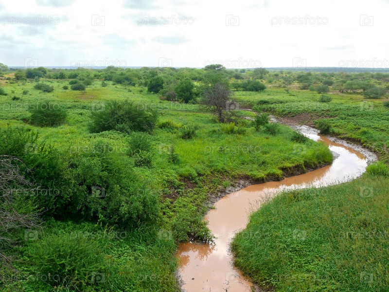 Пейзаж природа. Извилистая река. Деревья вокруг. Африка, Кения