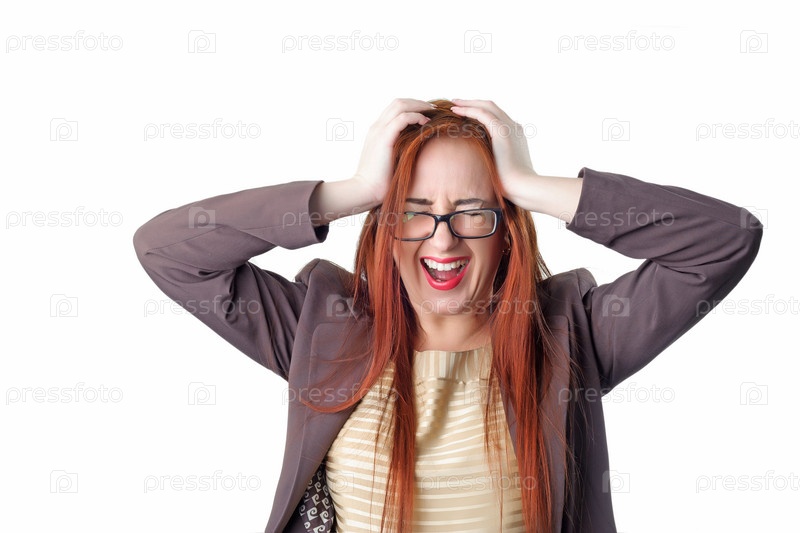 Рыжая молодая женщина кричит от головной боли