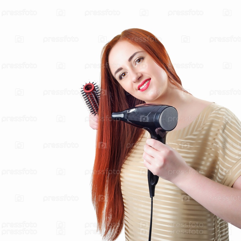 Рыжая женщина с длинными волосами, с феном и расческой