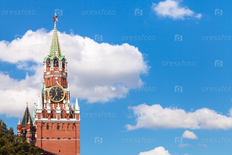 Спасская башня Московского Кремля и голубое небо
