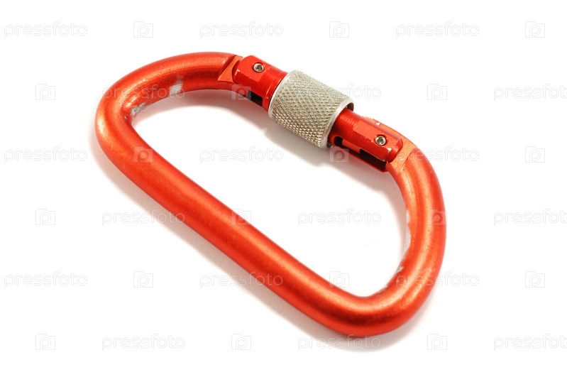 Старый красный алюминиевый альпинист карабин, изолированные на белом фоне