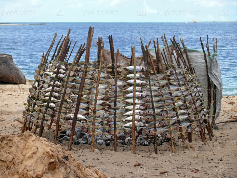 Мтвара, рыбу сушат над огнем. Танзания, Африка