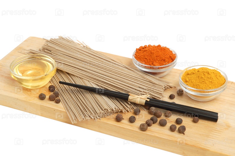 Азиатская рисовая лапша, специи и бамбуковые палочки для еды на доске