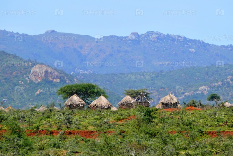 Эфиопские дома на фоне природы. Пейзаж природа. Африка, Эфиопия