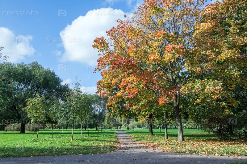 Парк в осенний сезон с листвой, желтый, оранжевый