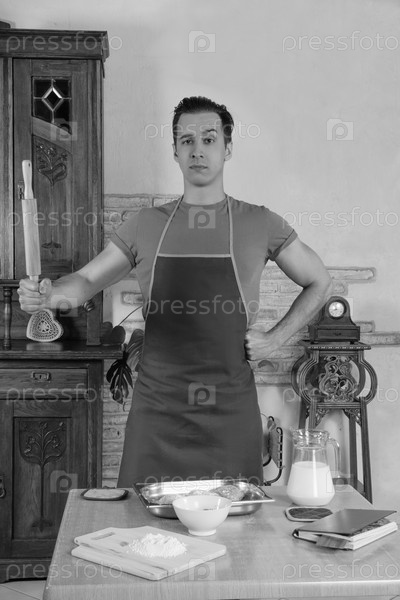 Человек на кухне со скалкой