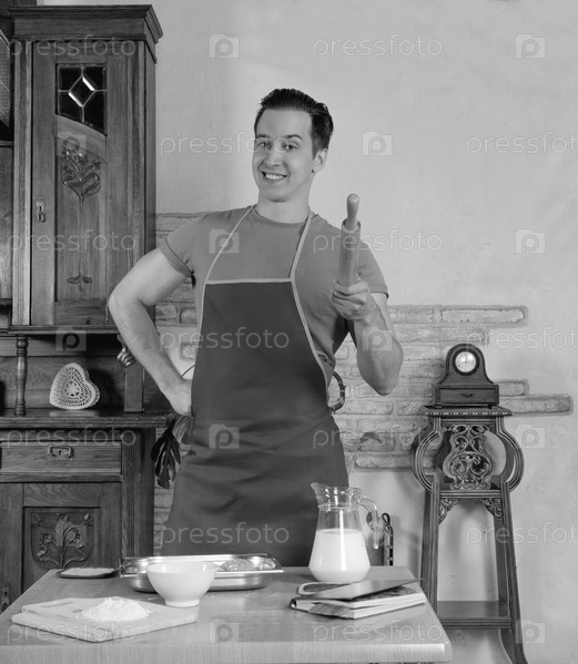 Человек на кухне со скалкой