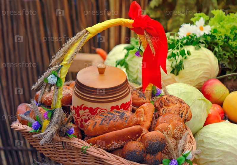 Корзинка с хлебом, украшенные лентами и овощами