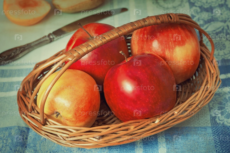 Большие яблоки в плетеной корзине