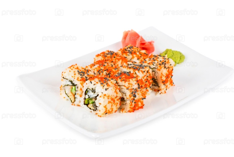 Роллы на блюде на белом фоне