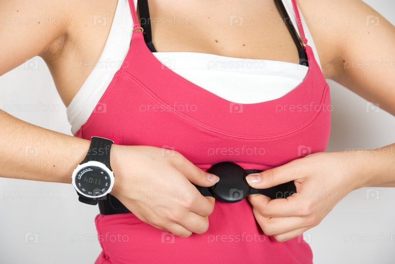 Девушка измеряет пульс специальным прибором во время занятий фитнесом