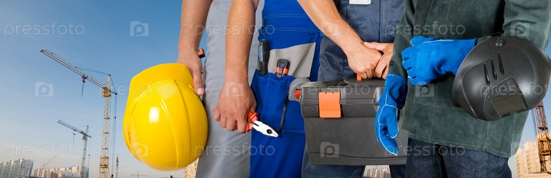 Бригада работников с касками и инструментами на фоне строящихся зданий и голубого неба