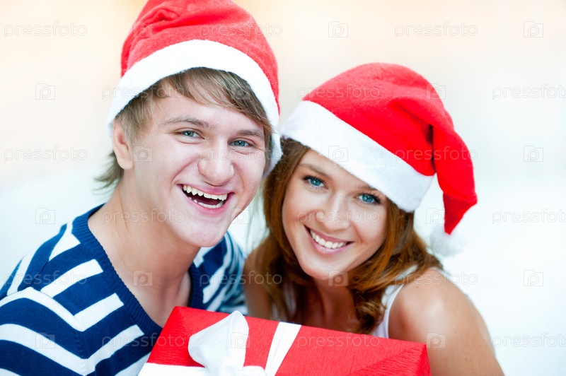 Молодая счастливая пара встречает Рождество