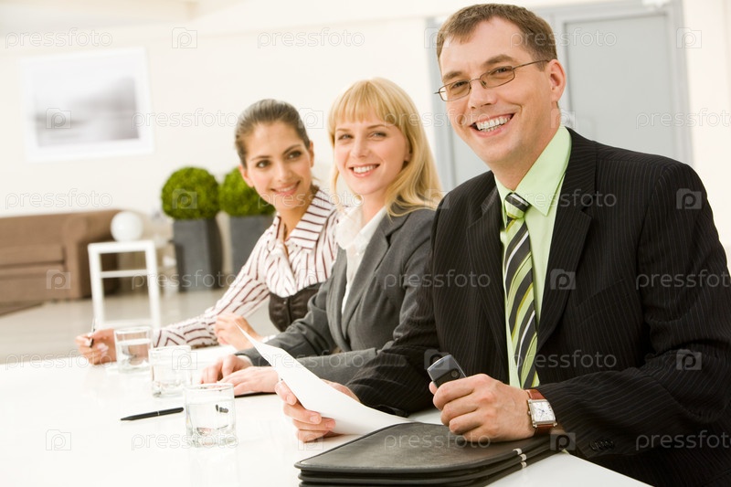 Ряд успешных бизнесменов, сидящих за столом с мужчиной перед собой