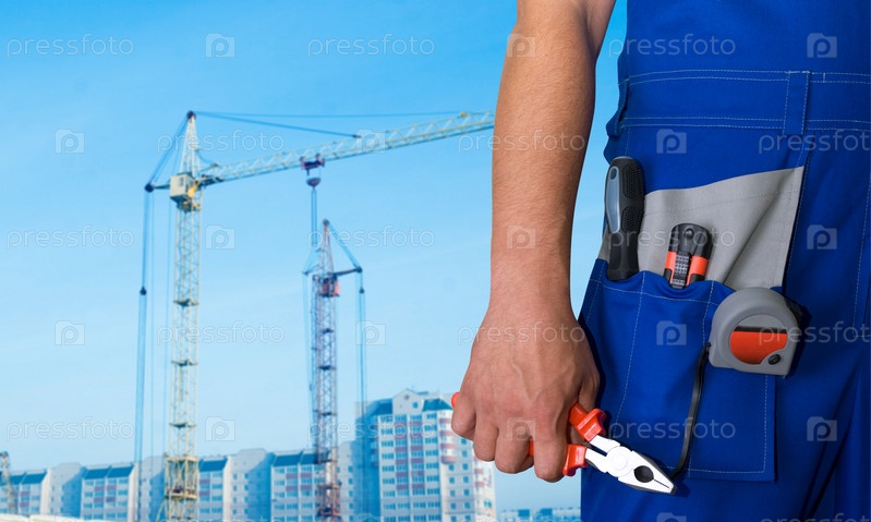Работник с плоскогубцами на фоне строящихся домов и голубого неба