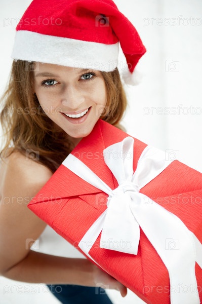 Счастливая девушка с подарком на Рождество