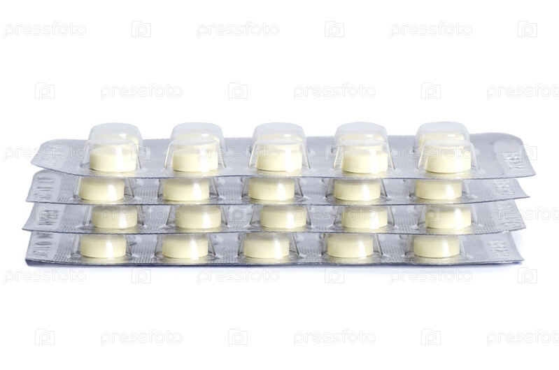 Стопка бластеров с таблетками на белом фоне