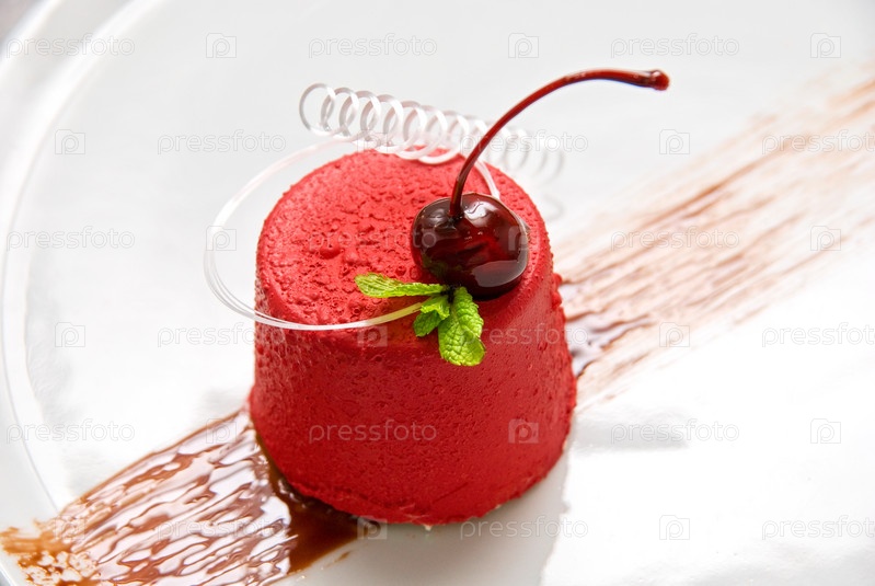Десерт из вишни и взбитых сливок с карамелью и мятой