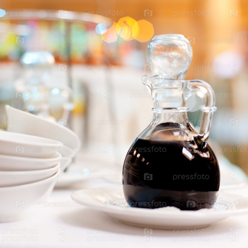 Соевый соус в стеклянном графине стоит на накрытом столе