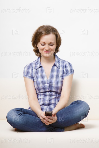 Счастливая молодая женщина с мобильным телефоном сидит на диване