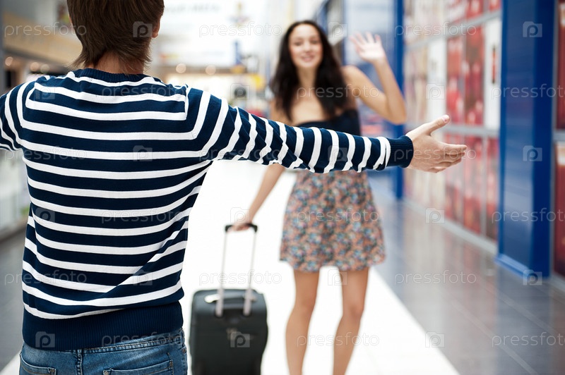 Молодой человек встречает подругу в аэропорту