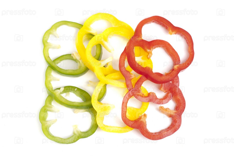 Красный, зеленый, желтый нарезанный перец на белом фоне