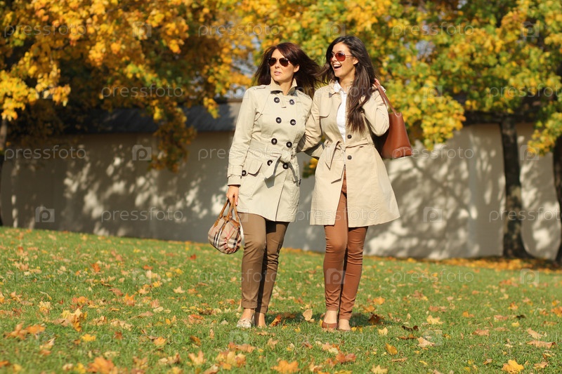 Две красивые сестры-близняшки на прогулке в осеннем парке