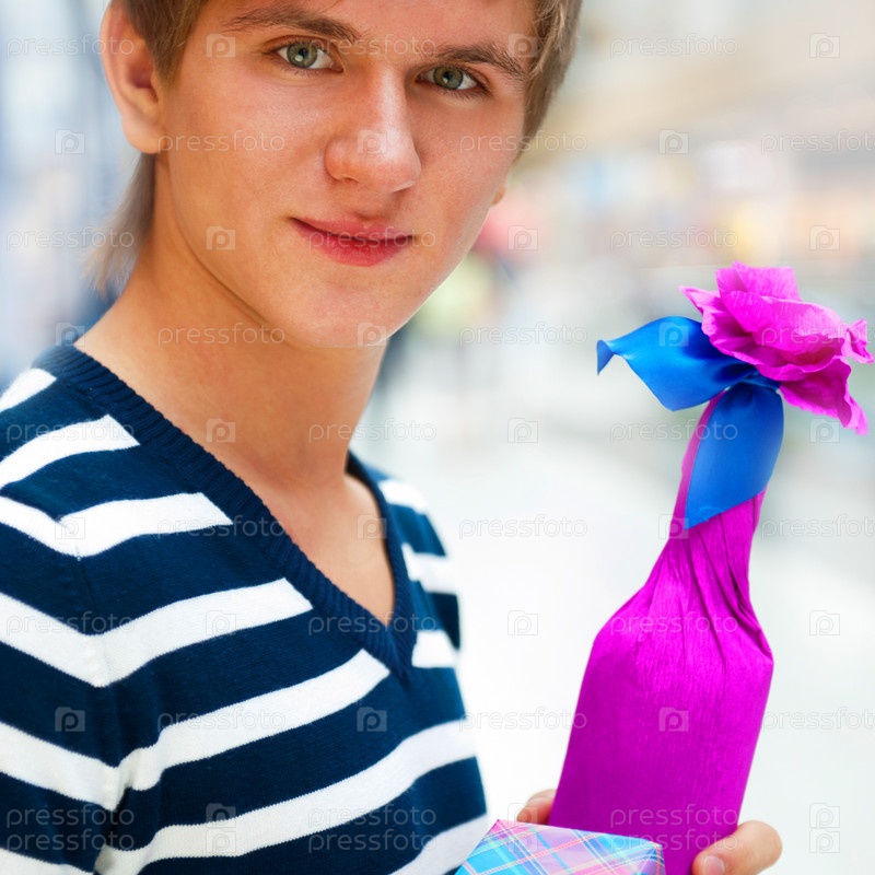 Портрет молодого человека с подарочной коробкой и бутылкой